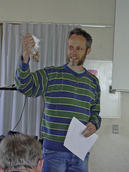 Lørdag formiddag havde vi gæstelærer Thure P. Hauser, som er lektor på Institut for Økologi, Faggruppe Botanik på Det Biovidenskabelige Fakultet (tidligere Den Kgl. Veterinær- og Landbohøjskole, KVL). Vi fik en god gennemgang af grundlæggende genetik, eller arvelighedslære, som vi kan bruge til at forstå, hvad vi skal passe på, hvis en sort skal holdes sortsren gennem generationer. Selvom det var det mest teoretiske indlæg, gav Thure gode eksempler, så stoffet var til at forstå for en flok ikke-botanikere.